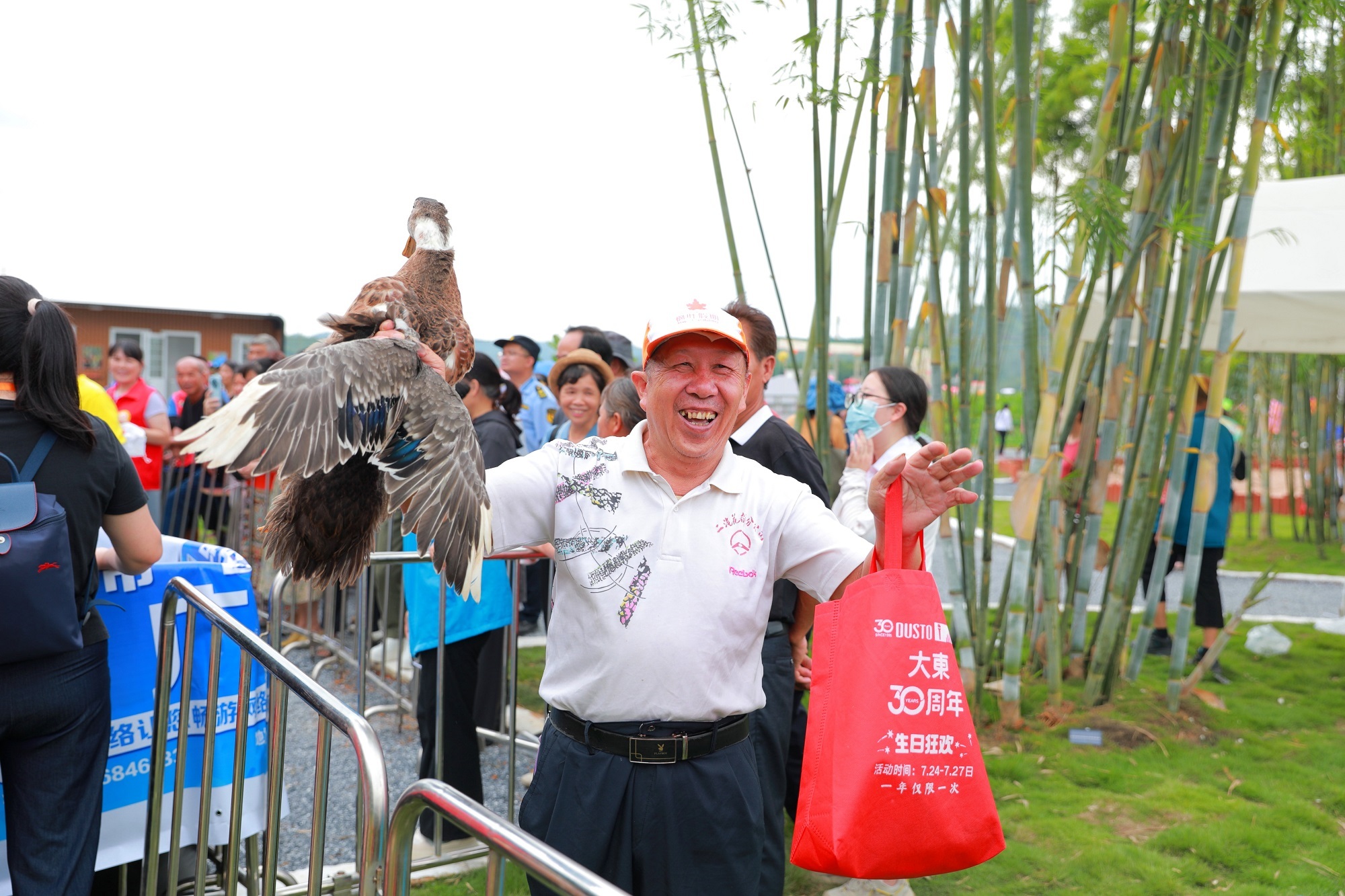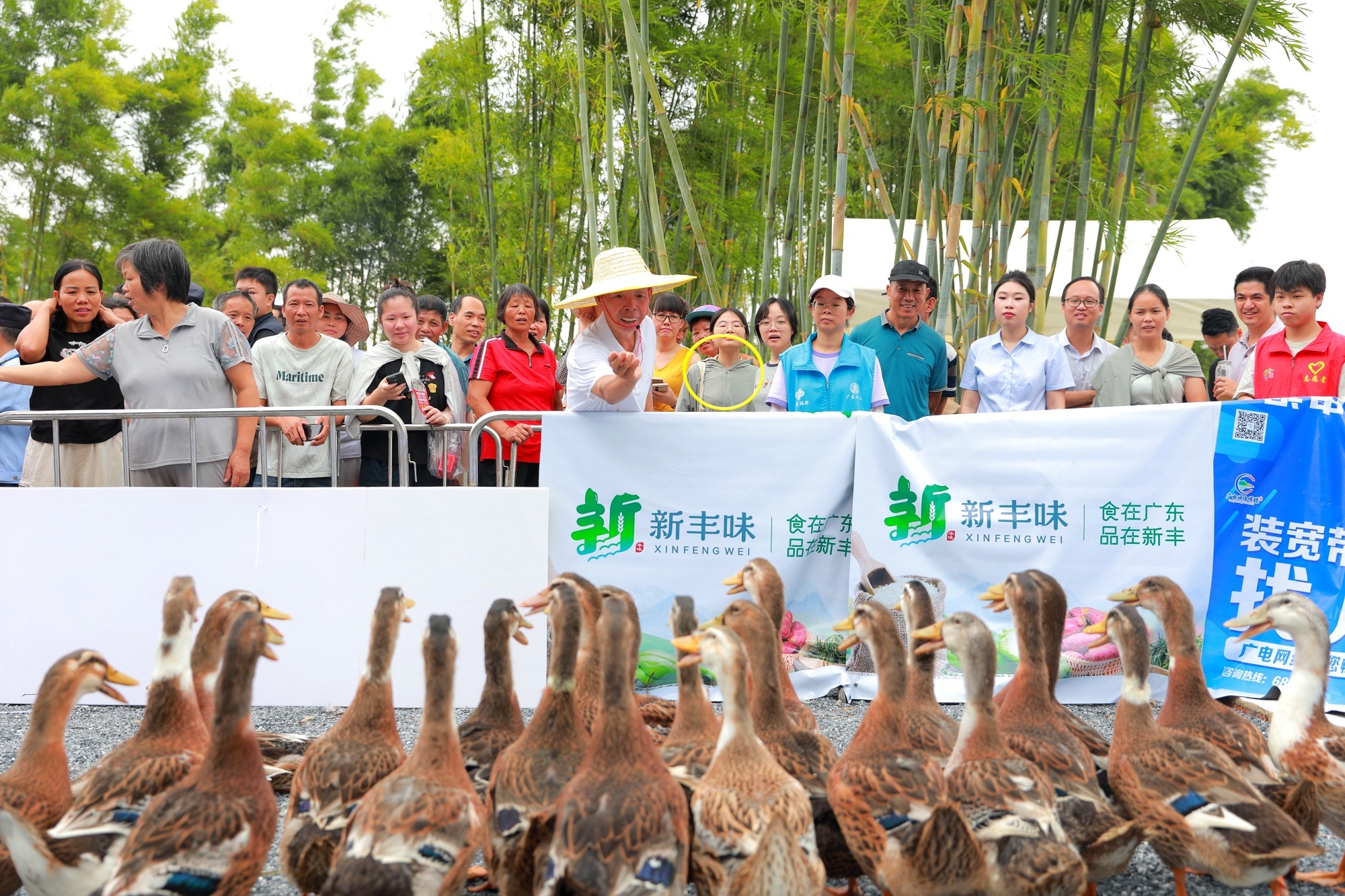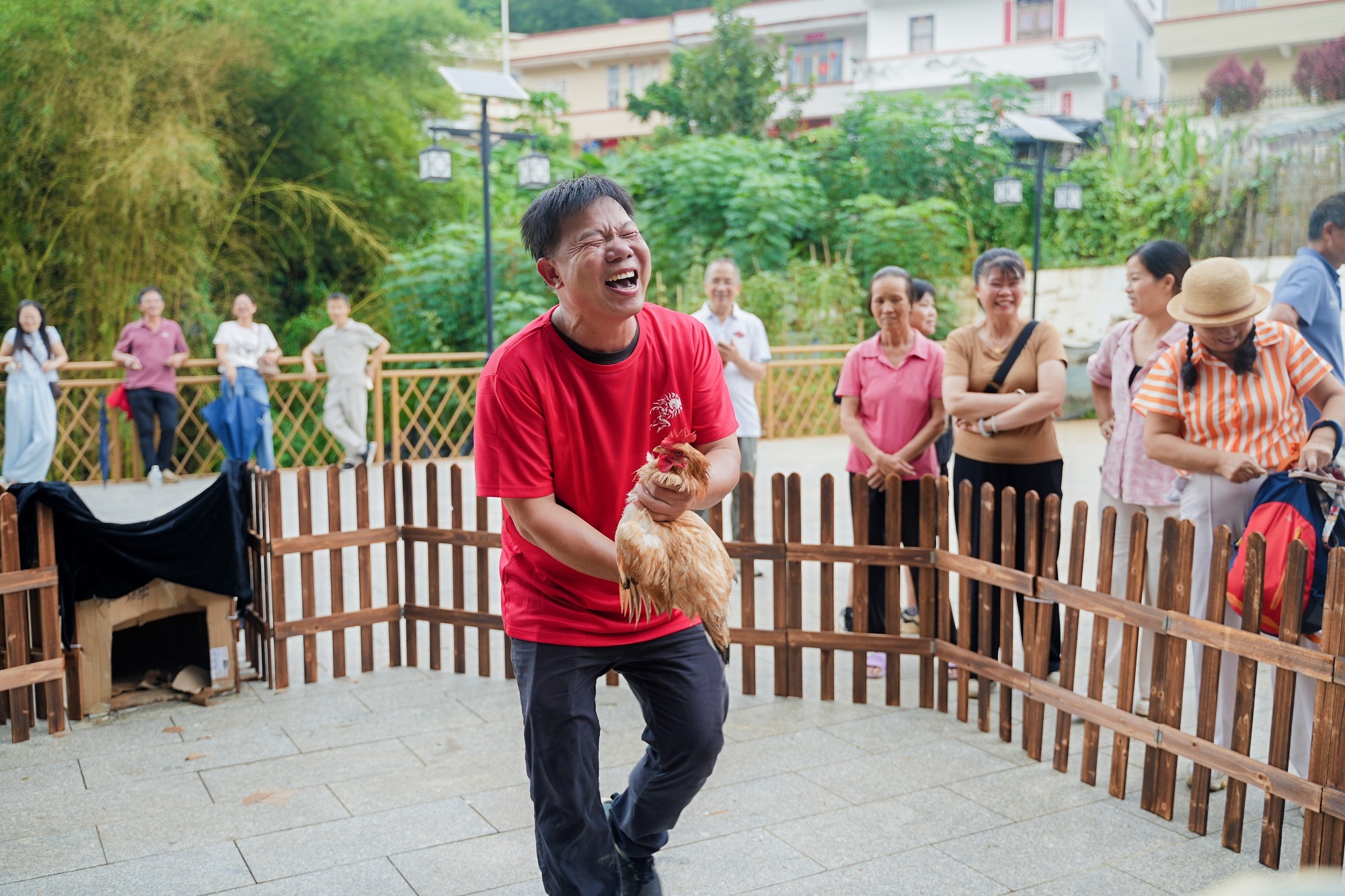封开分会场组织了逐鸡比赛,抓到杏花鸡的群众笑开了花。