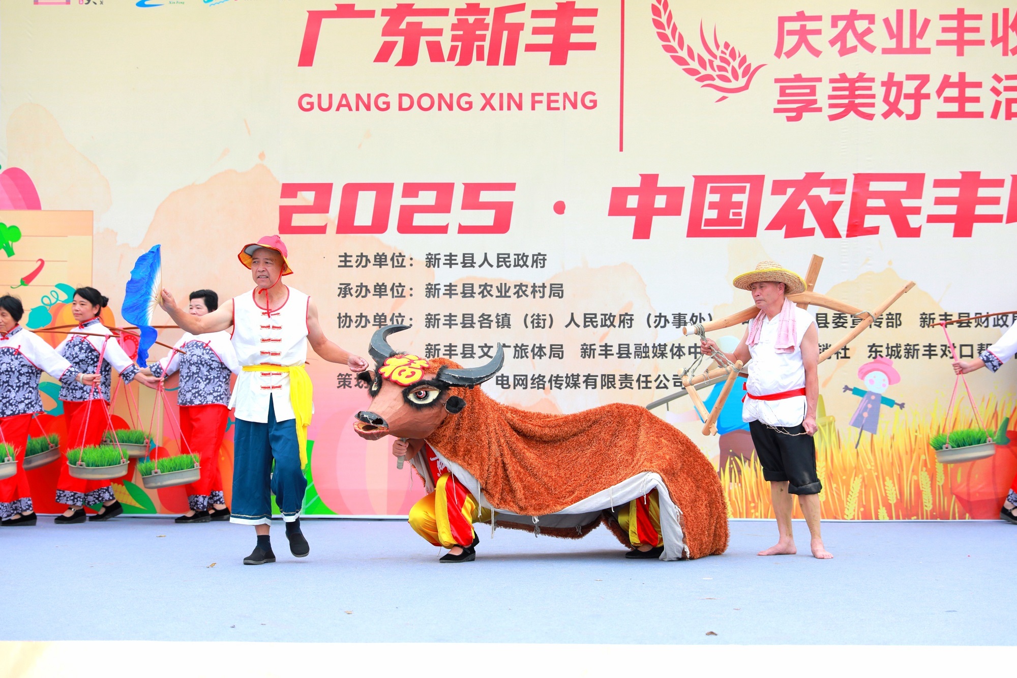 新丰分会场,农民用“舞春牛”表演表达对丰收的渴望。